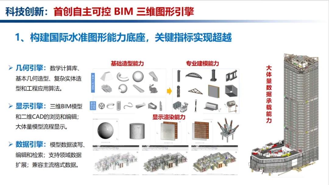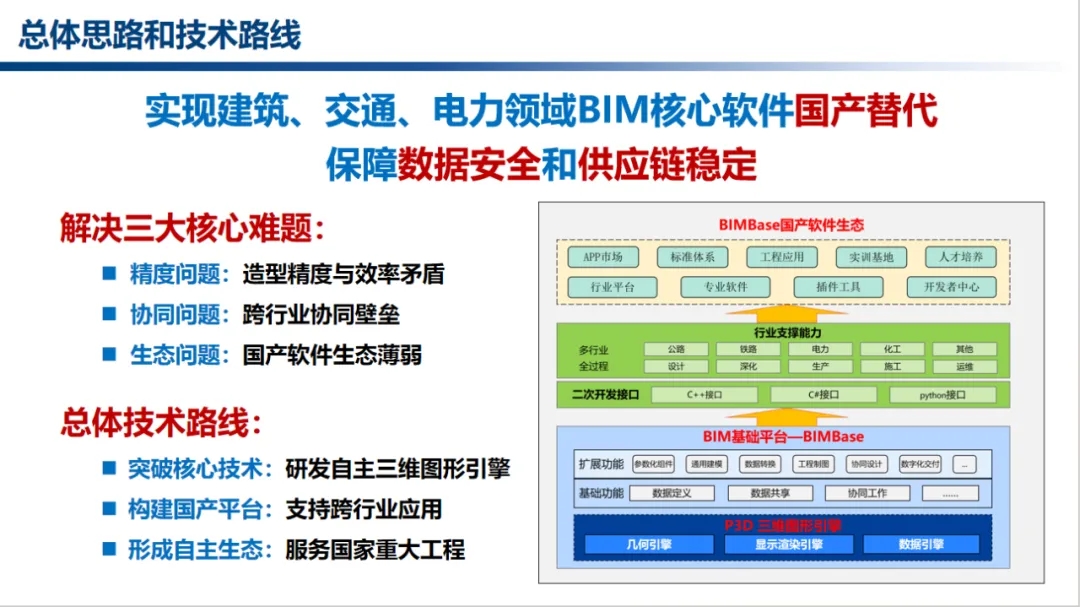 項目內(nèi)容:本項目面向建筑行業(yè)數(shù)字化轉(zhuǎn)型與國家信息安全重大需求,針對我國BIM軟件長期依賴國外技術(shù)、核心三維圖形引擎“卡脖子”、數(shù)據(jù)安全風(fēng)險突出等根本性問題,研發(fā)了國內(nèi)首款完全自主知識產(chǎn)權(quán)的BIM三維圖形引擎P3D及BIM底座平臺BIMBase,核心源代碼自主率達(dá)100%,攻克幾何造型復(fù)雜度控制、海量模型輕量化渲染、多源數(shù)據(jù)互通等核心技術(shù),關(guān)鍵性能指標(biāo)達(dá)到國際主流水平,填補了國內(nèi)BIM圖形引擎和基礎(chǔ)平臺的空白?;谠撈脚_開發(fā)的PKPM-BIM、PKPM-PC等70余款專業(yè)軟件,覆蓋建筑設(shè)計、裝配式建造、綠色低碳分析、智能審查等全生命周期場景,實現(xiàn)從方案設(shè)計、構(gòu)件生產(chǎn)到施工運維的全流程數(shù)據(jù)貫通,打破了國外軟件在建筑工程核心領(lǐng)域的長期壟斷,實現(xiàn)了國產(chǎn)BIM軟件從“無芯可用”到“生態(tài)構(gòu)建”的跨越式突破。目前,BIMBase系列軟件已推廣應(yīng)用于全國6000余家企業(yè),覆蓋3億平米建筑工程。項目編制標(biāo)準(zhǔn)10余項,軟件著作權(quán)70余項、發(fā)明專利14項,近三年經(jīng)濟效益突破3.8億元。項目成果顯著提升了建筑行業(yè)數(shù)字化水平,成為我國工程建設(shè)領(lǐng)域數(shù)字化轉(zhuǎn)型的標(biāo)志性成果。